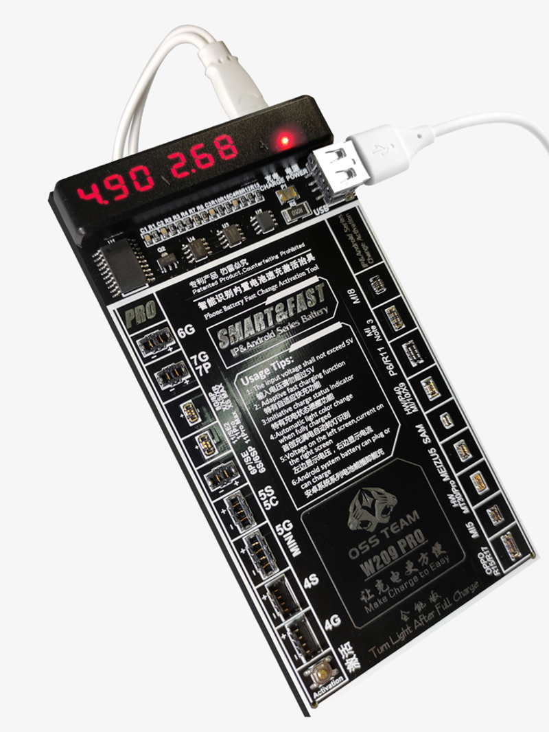 OSS Team W209 Pro V5 - компактный прибор, сочетающий функции активатора разряженных аккумуляторных батарей и ЗУ. Гаджет предназначен для индивидуального использования и/или для работы в специализированных мастерских, сервисных центрах. Поддерживает работу с батареями Apple iPhone 4-12, а также большинством аккумуляторов, устанавливаемых в смартфоны на базе Android от Samsung, Xiaomi, Honor и других брендов.